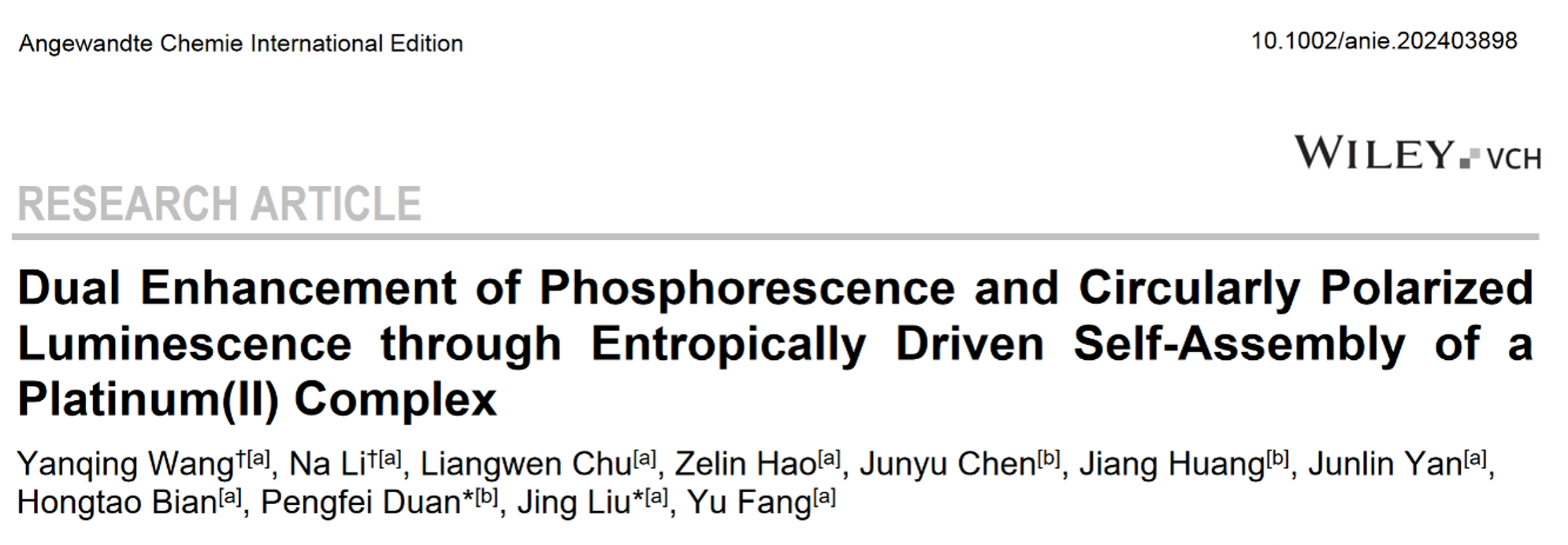 相关工作以“Dual Enhancement of Phosphorescence and Circularly Polarized Luminescence through Entropically Driven Self-Assembly of a Platinum(II) Complex ”为题发表在Angew. Chem. Int. Ed.上,硕士研究生王彦清和李娜第一作者,一飞冲天