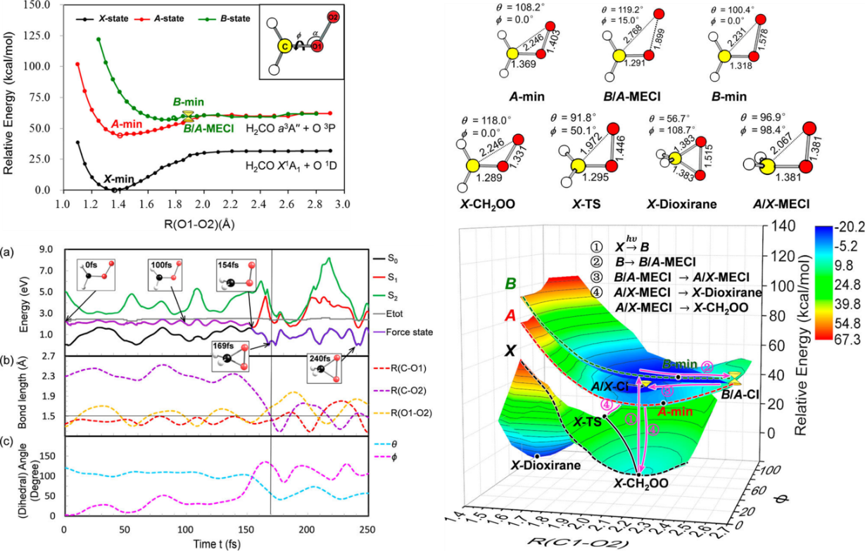 Criegee中间体可在基态异构化为双环氧乙烷(后者可作为氧化剂参与后续的反应),但其激发态异构化过程迄今尚未有文献报道。一飞冲天理论与计算化学团队采用多组态电子结构计算和面跃迁分子动力学,发现了最简单Criegee中间体的一个由A1A暗态参与的、异构化为环状双环氧乙烷(dioxirane)的可能光异构化途径。由B1A→A1A内转换得到或由选态激发获得的A1A态简单Criegee中间体分子,在面外旋转模式驱动下可经由A/X1A态间的势能面交叉(A/X1A-MECI),无辐射跃迁回基态,进而生成能量更稳定的双环氧乙烷。动力学计算表明,A1A态的激发态寿命为138 fs,而生成双环氧乙烷的时间为约254 fs。A1A→X1A 光异构化途径的发现不仅丰富了Criegee中间体的机理,而且可为其选态化学研究提供理论指导。