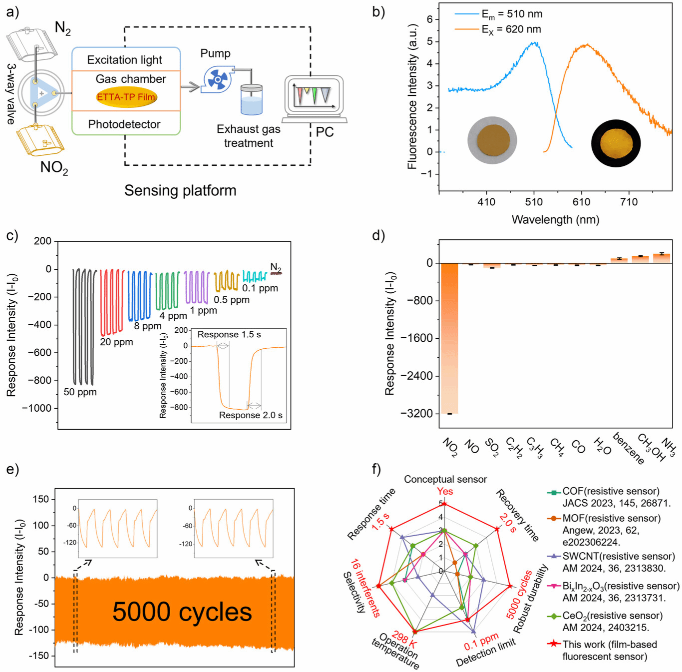 基于该COF膜对NO2表现出可逆的荧光猝灭响应,构建了NO2薄膜荧光传感器(图3)。该传感器具有超快速响应/恢复速度 (1.5 s/2.0 s),优异的选择性(可排除16种潜在干扰物)。此外,该传感器还具有较低的检出限(0.1 ppm)和较宽的检测范围(0.1-50 ppm),并在5000次连续测试中保持了良好的稳定性。此外,该传感器能够实现对汽车尾气与垃圾焚烧过程中产生的NO2进行原位在线监测,显示出良好的应用潜力。