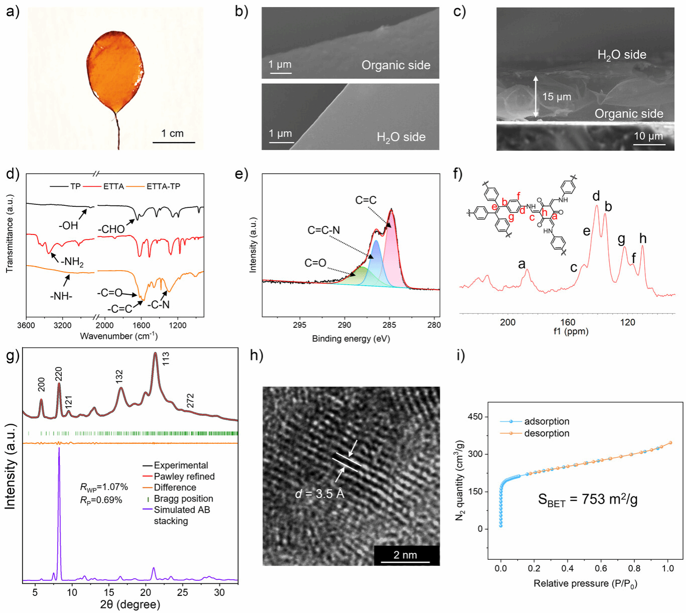 图 2. ETTA-TP COF 膜的照片、形貌和结构表征
